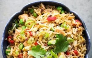 Προσθέτουμε τον αρακά, το σολομό και τα φρέσκα κρεμμυδάκια. Ανακατεύουμε και ρίχνουμε το μείγμα με τη σος σόγιας. Απομακρύνουμε από τη φωτιά. Γαρνίρουμε με μαϊντανό και σερβίρουμε αμέσως.